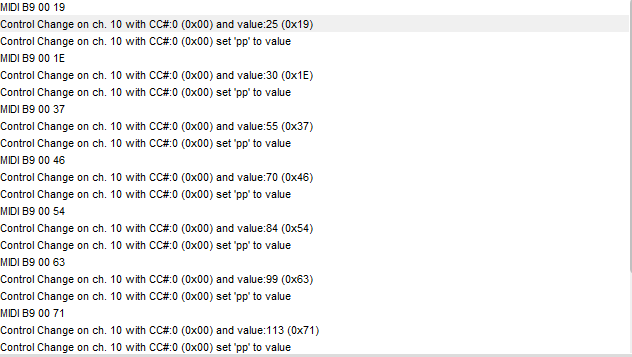 Output : Raw MIDI b9 xb tt